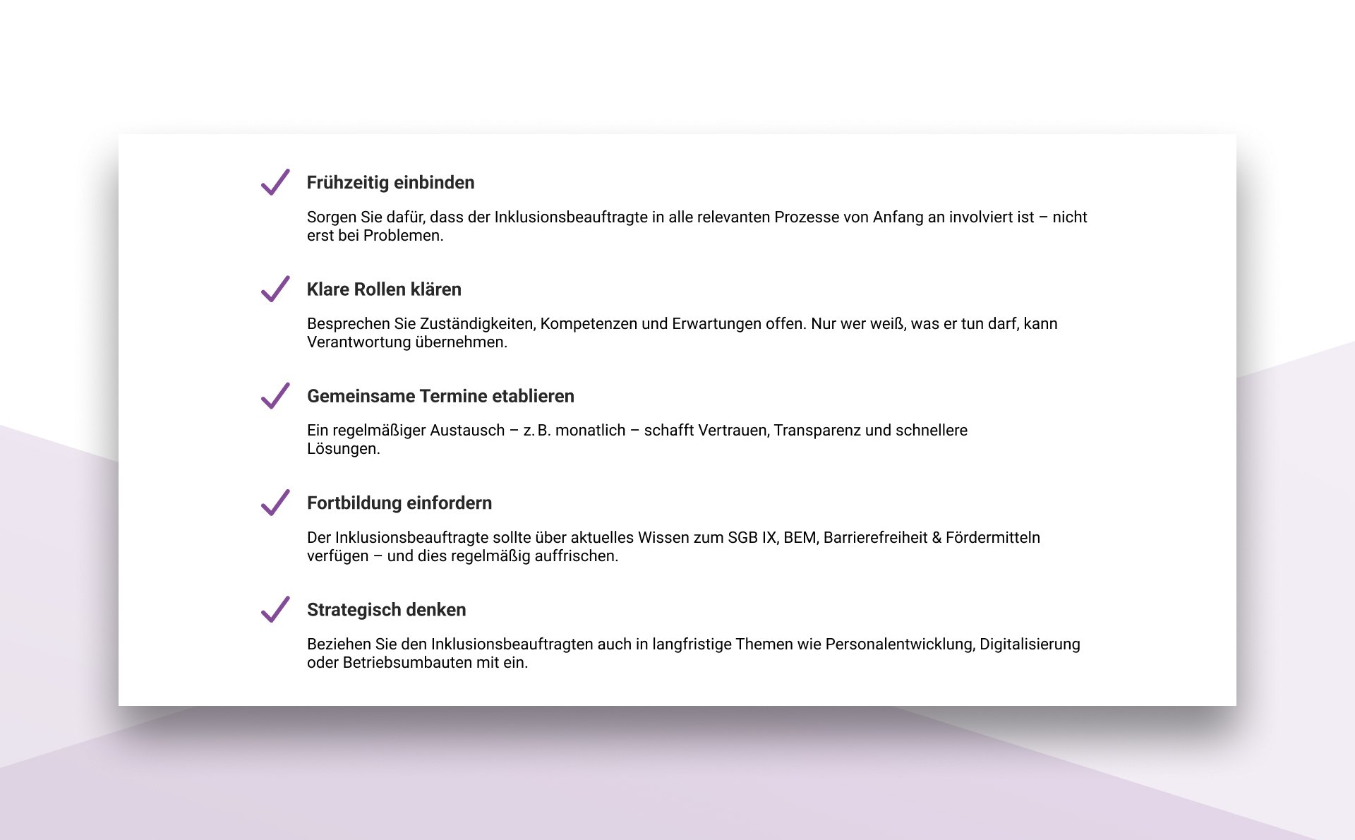 In der betrieblichen Realität hängt viel vom persönlichen Engagement ab – aber auch von der Kultur des Miteinanders. Dort, wo SBV, Inklusionsbeauftragte und Personalverantwortliche regelmäßig miteinander sprechen, gemeinsame Ziele formulieren und sich gegenseitig informieren, funktioniert Inklusion spürbar besser. Die wichtigsten Erfolgsfaktoren aus der Praxis: