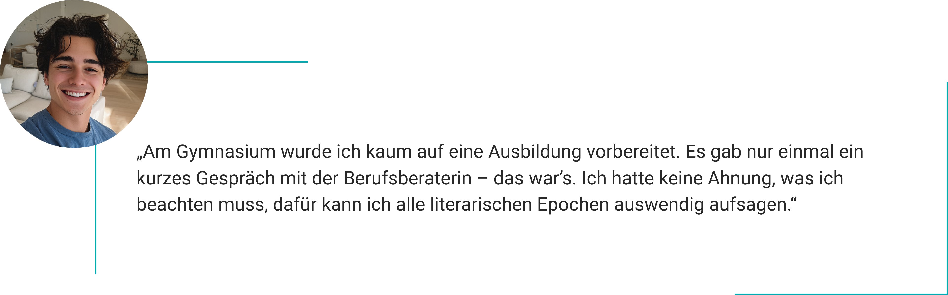 Auch wenn Schulen jungen Menschen eigentlich helfen sollten, ihren Platz in der Gesellschaft zu finden, wird gerade an Gymnasien die Berufsausbildung als zweitrangig betrachtet. Die Skills der Jugendlichen werden kaum gefördert und sie werden viel zu wenig auf das Arbeitsleben vorbereitet. Jonas, angehender Industriemechaniker: